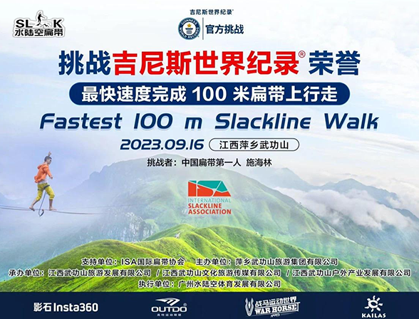 2023年9月,团队创始人施海林在国家5A级景区-户外天堂武功山,进行高空扁带吉尼斯纪录挑战,成功创造了100米最快吉尼斯世界纪录,不但成为中国首个高空扁带吉尼斯世界纪录保持者,也做到了中国的速度成为世界的速度